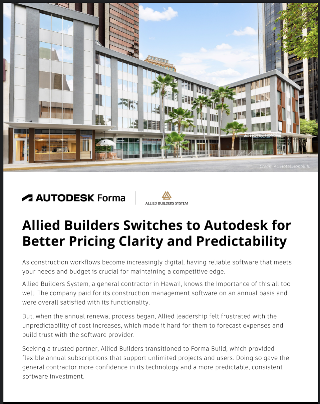 Allied Builders System transitioned to Autodesk Forma to gain greater control over costs and eliminate unpredictable pricing. With a flexible subscription model and access to essential project management capabilities, the team improved budgeting confidence while streamlining operations. Discover how Forma helped Allied Builders enhance efficiency and build trust in their technology investment.