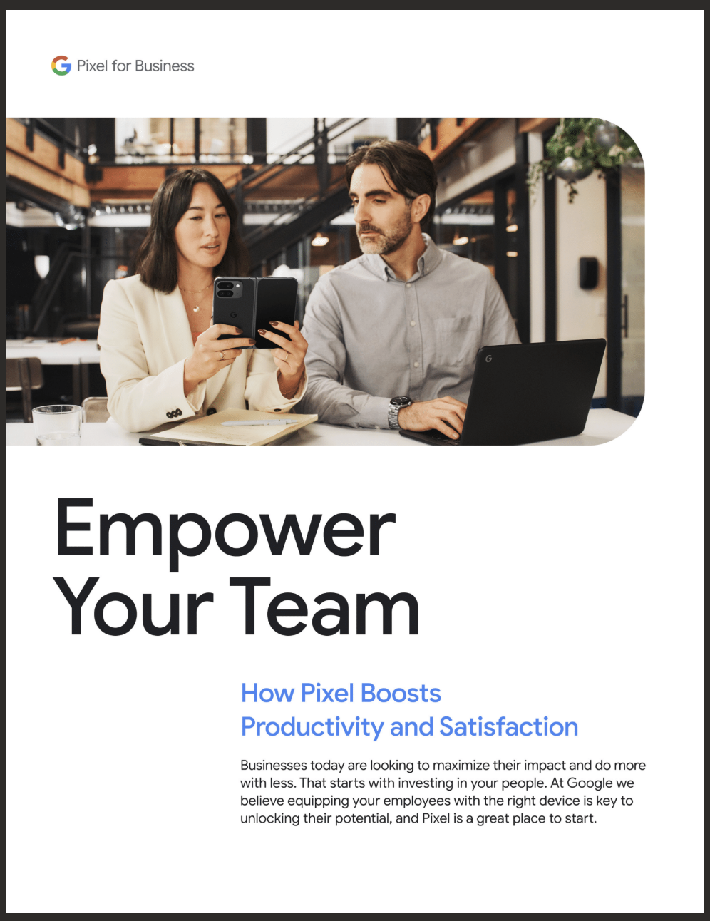 Businesses today are looking to maximize their impact and do more with less. That starts with investing in your people. At Google we believe equipping your employees with the right device is key to unlocking their potential, and Pixel is a great place to start.