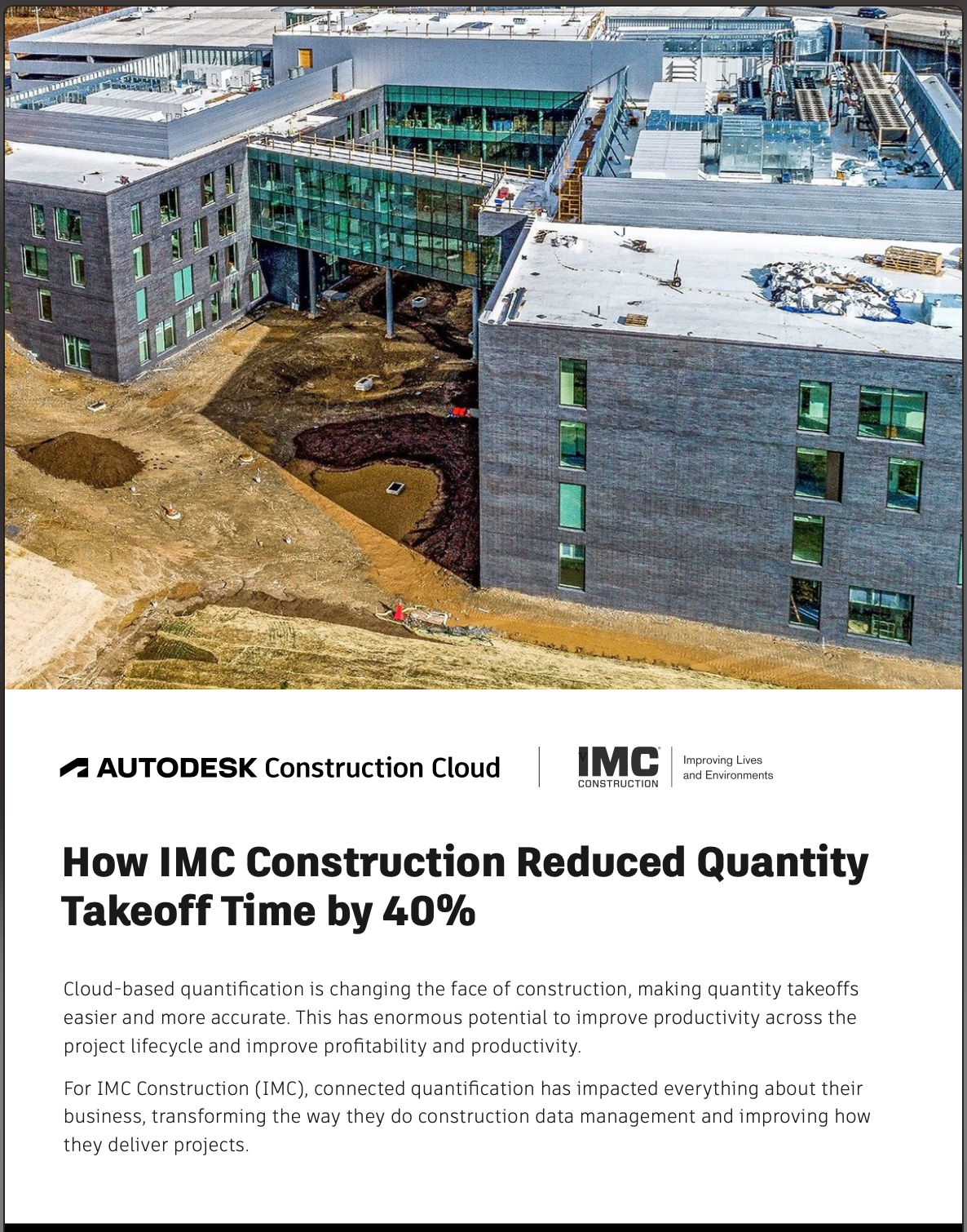 IMC Construction transformed its preconstruction workflows by using Assemble within Autodesk Construction Cloud to streamline quantity takeoffs and normalize project data. By moving away from manual comparisons of drawings and adopting cloud-based quantification, IMC cut takeoff time by 40%, improved reporting with Power BI, and enhanced collaboration with owners and project teams. Read how IMC leverages connected data management to deliver faster, more accurate, and more cost-effective results.