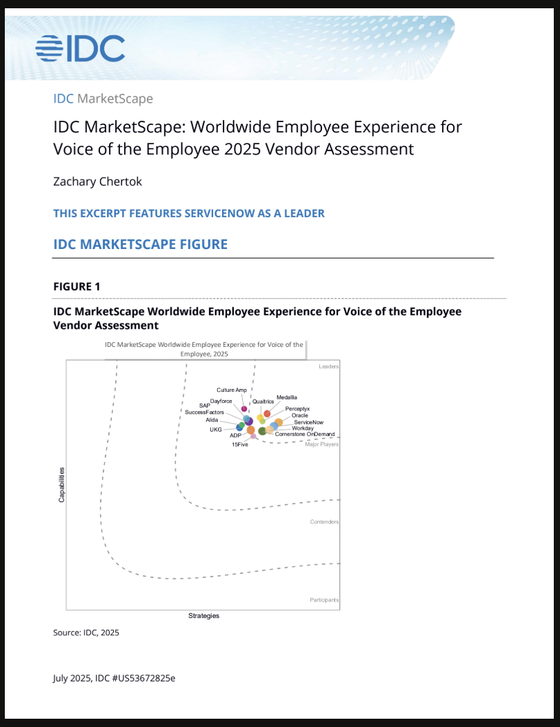 ServiceNow has been recognized as a leader in the 2025 IDC MarketScape: Worldwide Employee Experience for Voice of the Employee.