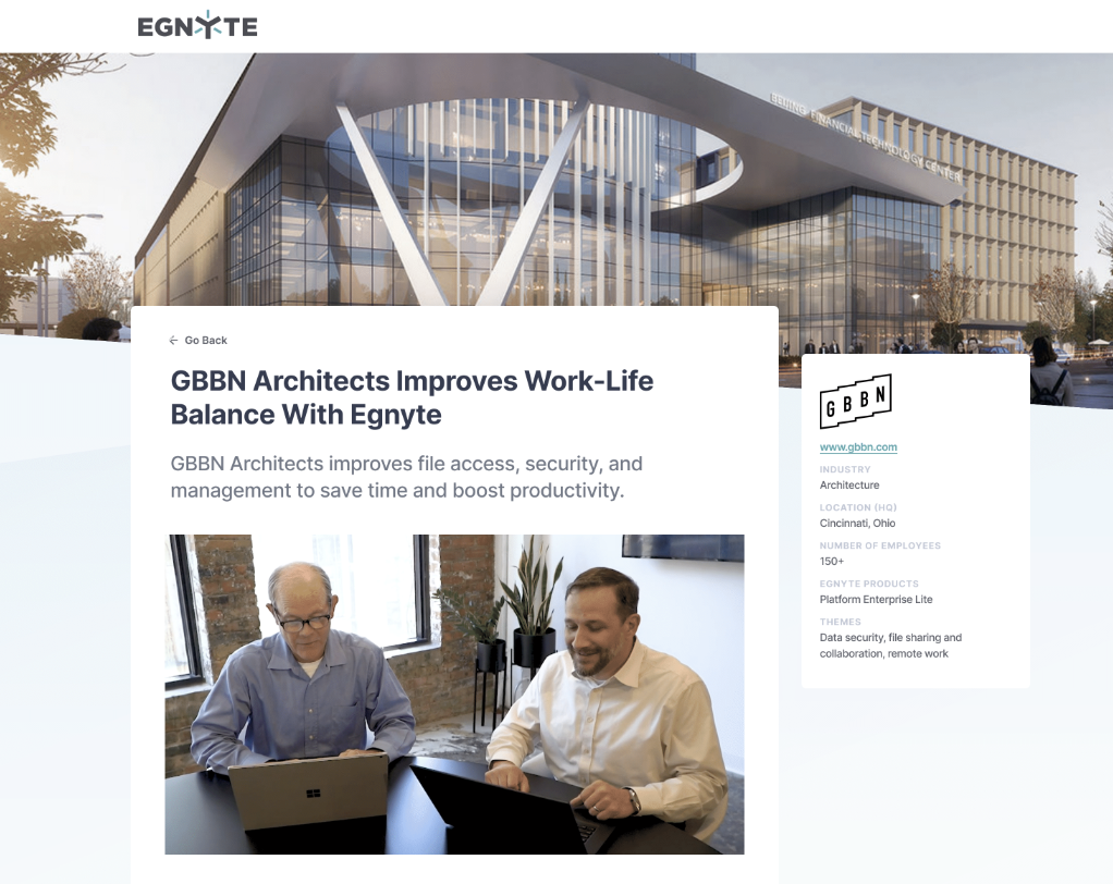 GBBN Architects replaced on-premises file storage with Egnyte to support its growing volume of data and a team of more than 150+ employees distributed across several states. Learn