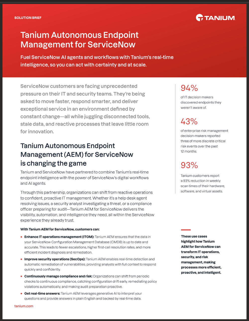 Organizations relying on ServiceNow increasingly struggle with fragmented tools, outdated data, and reactive IT and security processes that slow productivity and elevate risk. Tanium Autonomous Endpoint Management (AEM) for ServiceNow transforms this landscape by combining Tanium’s real‑time endpoint intelligence with ServiceNow’s AI‑driven digital workflows. This integration delivers continuous visibility, automated remediation, and trustworthy, real‑time data directly within the ServiceNow experience.