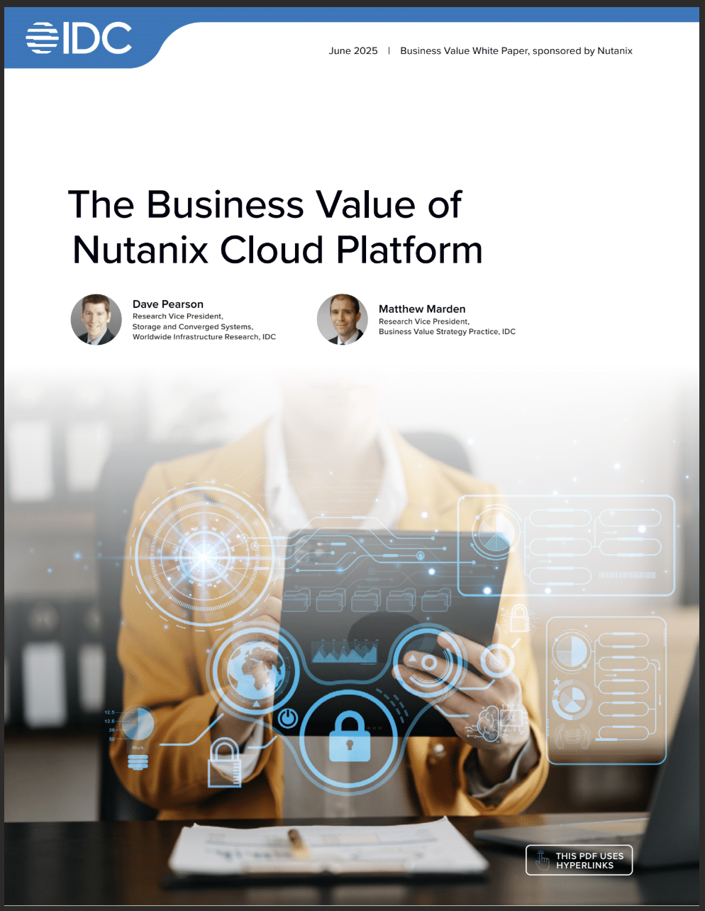 IDC surveyed organizations about their experiences with the Nutanix Cloud Platform (NCP) versus their previous approach to infrastructure, then quantified the differences. This IDC white paper shares details that you can use to understand the improvements in agility, efficiency, scalability, and availability that come with using Nutanix solutions built on hyperconverged infrastructure (HCI).