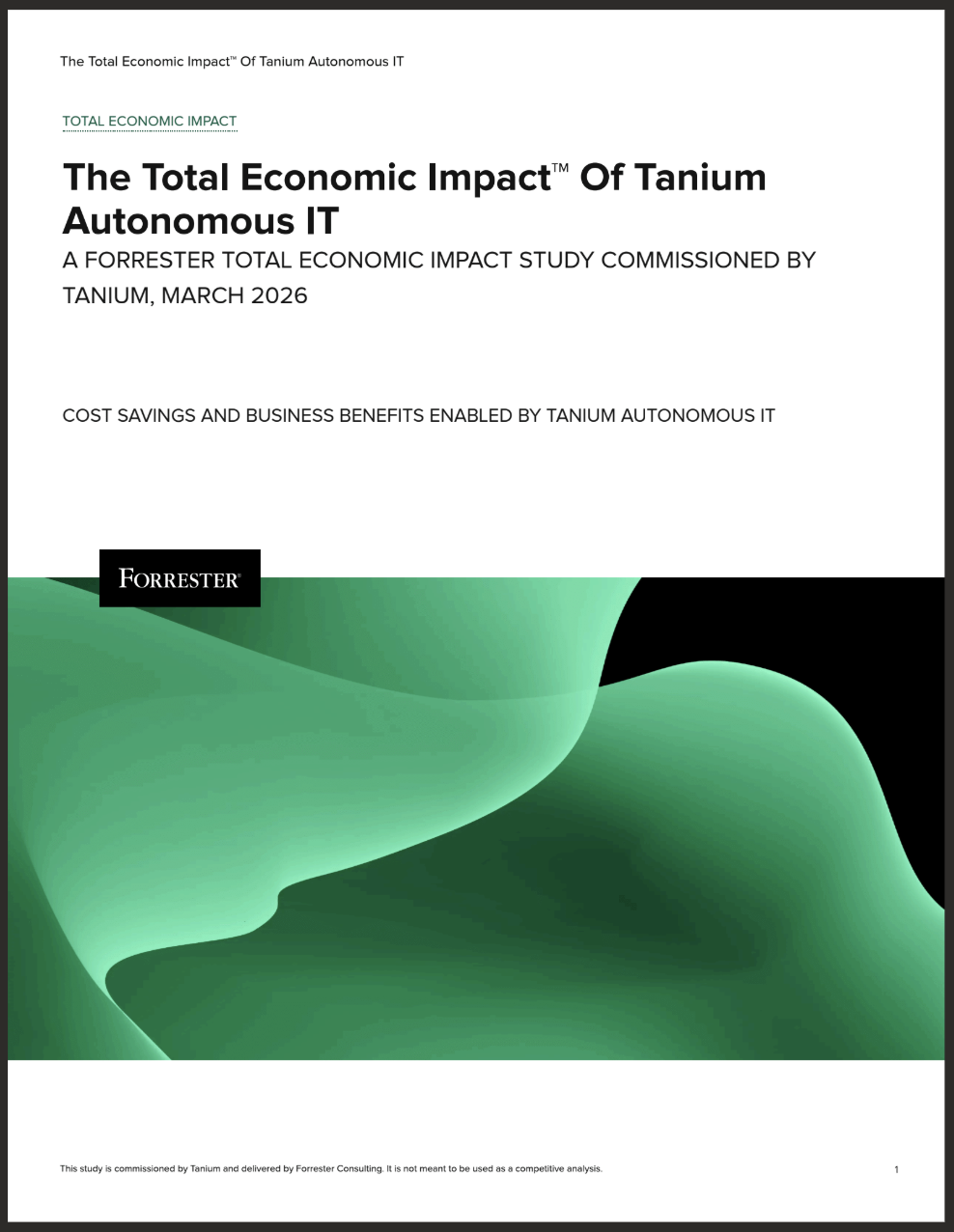 Every tech investment is expected to deliver financial return. This 2026 Forrester Consulting® study, commissioned by Tanium, captures the benefits, risks, and implementation realities of Tanium Autonomous IT through the lens of the Total Economic Impact™ framework. With the data on hand, you can decide if the numbers support your FY27 strategy.
