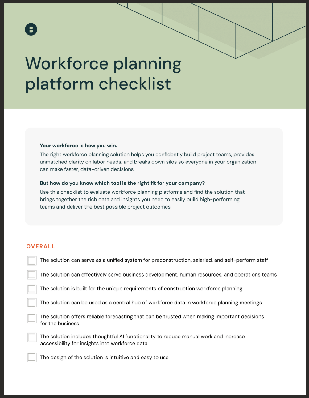 Use this checklist to evaluate workforce planning platforms and find the solution that brings together the rich data and insights you need to easily build high-performing teams and deliver the best possible project outcomes.